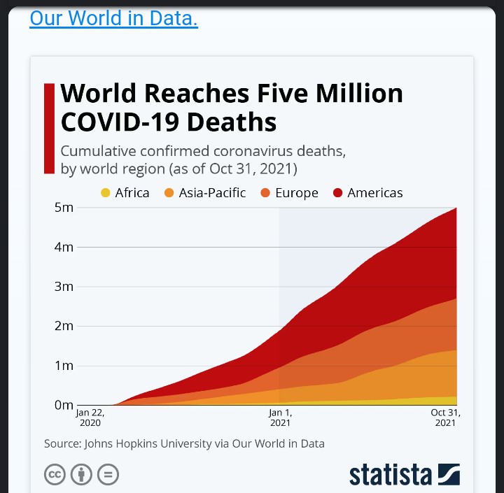 Look at cumulative deaths from COVID -19 by world region reveals several striking facts that might go against people’s impression of the state of the pandemic. Corona virus deaths have been rising consistently throughout 2021 and death counts have not been recently slowed down. The death toll accelerated towards the end of 2020 and has kept up its trajectory.